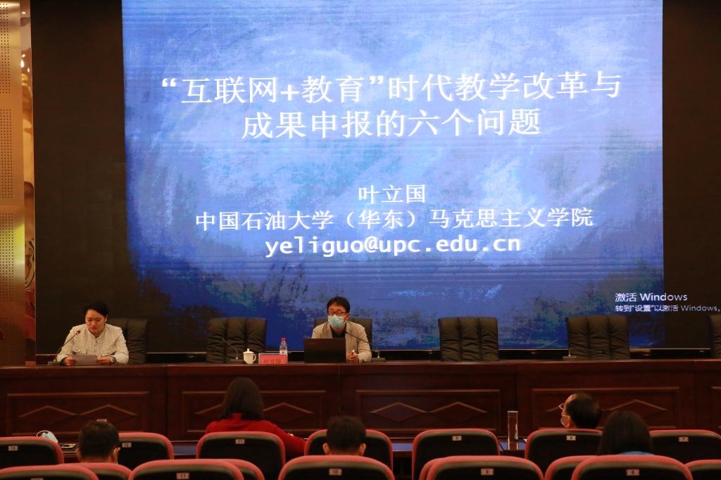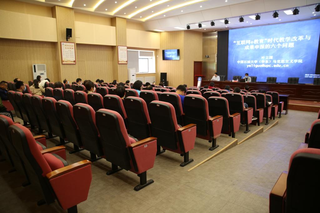 为进一步落实习近平总书记关于思政课教学的重要指示,提升思政课思想性、理论性、针对性和亲和力,提升教学质量,多出优质教学成果,中国石油大学(华东)叶立国副教授做客学院,19日上午,在J9-144报告厅做了题为“‘互联网+教育’时代教学改革与成果申报的六个问题”的主题报告,学院全体教职工参加报告会,会议由副院长常春主持。