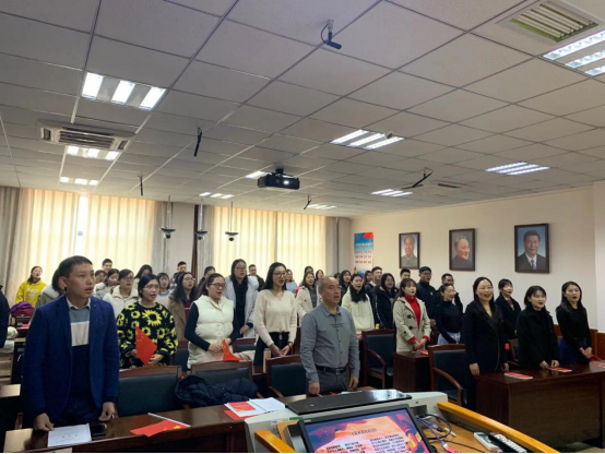 上午10点,宪法宣讲开幕式启动。主持人介绍了活动前期准备工作以及宪法知识调查问卷结果。学院巩永杰老师带领全体师生齐唱国歌,活动在热烈的气氛中拉开帷幕。
