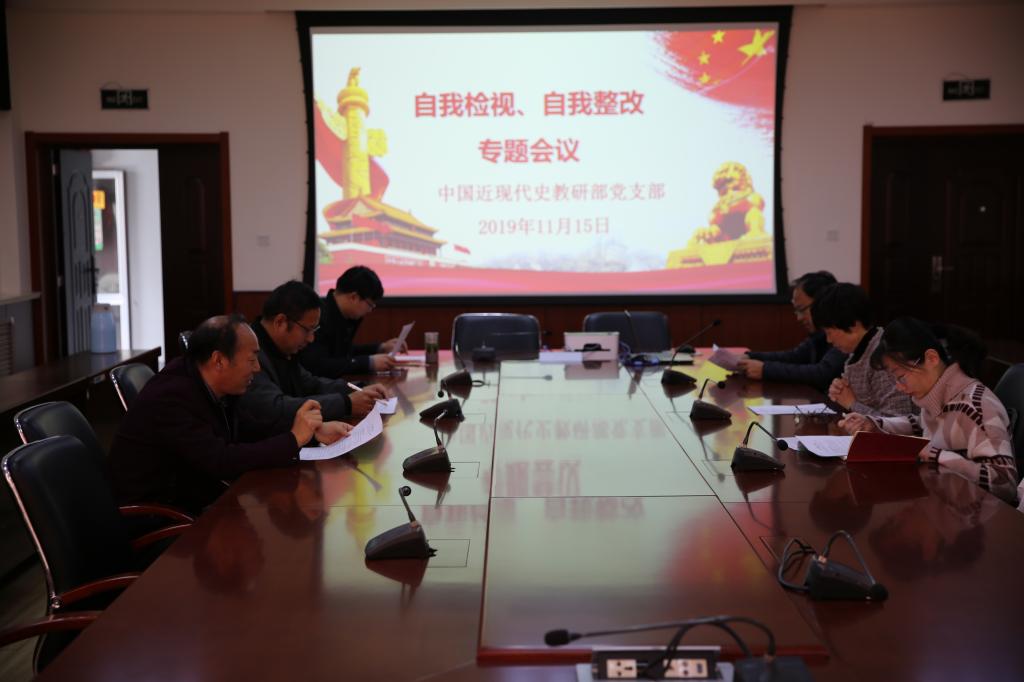11月15日,根据学校“不忘初心、牢记使命”主题教育工作安排,中国近现代史教研部党支部在J9-223会议室召开“自我检视、自我整改”专题会议。会议由支部书记宋开金主持,副院长邵勇与支部全体党员参加。