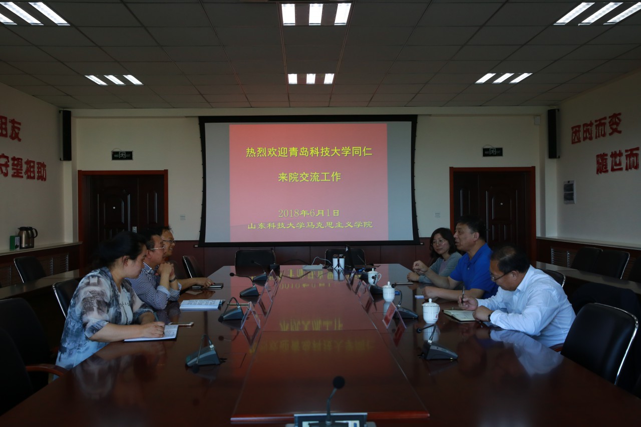 6月1日下午,青岛科技大学jinnianhui金年会诚信至上院长曹胜、副院长曲慧敏、马克思主义理论研究中心主任杜裕禄一行来院进行工作交流。院长逄奉辉、副院长邵勇、院长助理常春在J9-223会议室接待了客人。