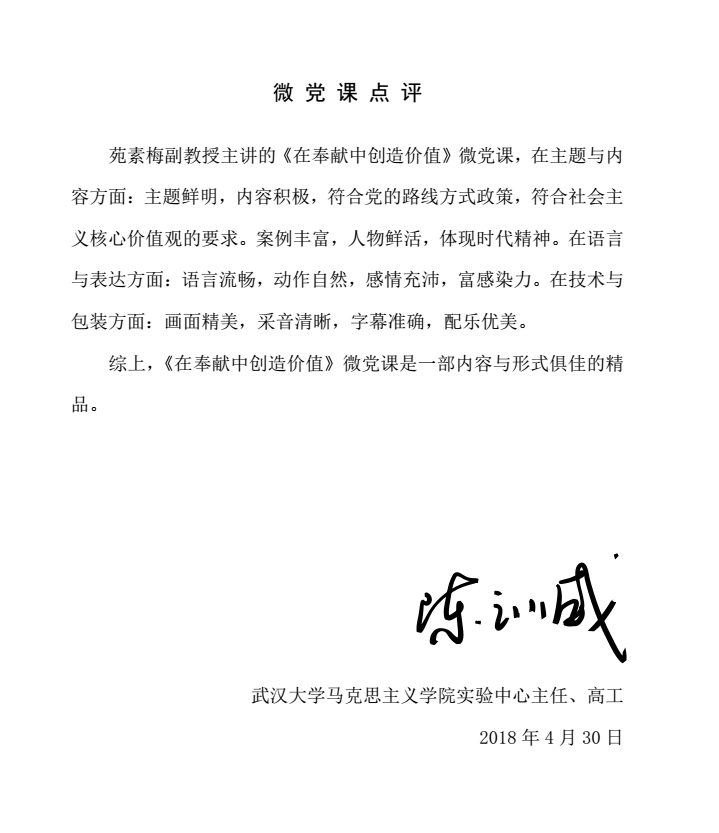 社会科学教育学院德育教研室主任任者春教授也以语音的形式进行了中肯的评价:该作品选题新颖,讲授生动,主题鲜明、政治性强,具有较强的教育意义和艺术魅力,是一篇风格独特引人入胜的党建教育作品,值得宣传推广。