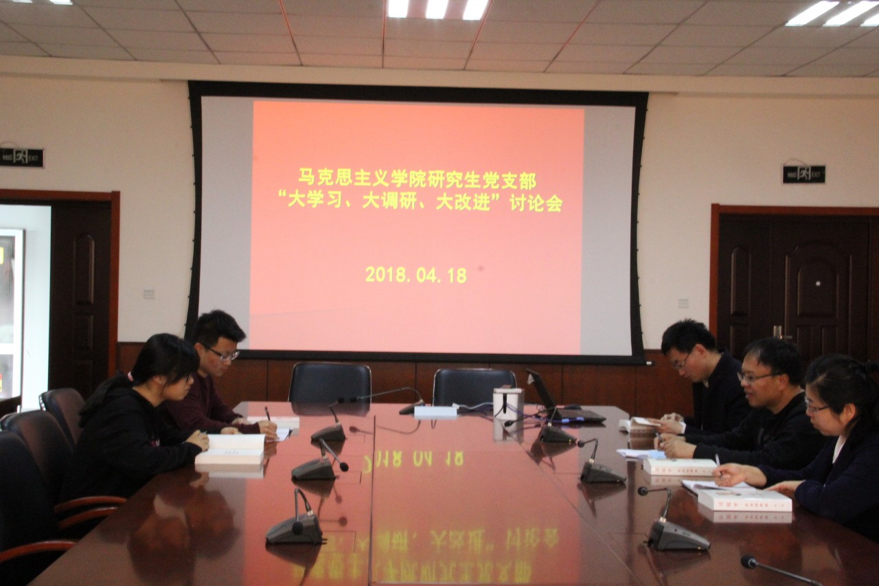 2018年4月17日,马克思主义基本原理教研部党支部召开“大学习、大调研、大改进”讨论会,院长逄奉辉参加指导会议,支部全体党员参加。 2018年4月17日,形势与政策教研部党支部召开“大学习、大调研、大改进”讨论会,支部全体党员参加。 2018年4月18日,中国近现代史教研部党支部召开“大学习、大调研、大改进”讨论会,副院长邵勇参加指导会议,支部全体党员参加。 2018年4月18日,中国马克思主义理论教研部党支部召开“大学习、大调研、大改进”讨论会,副院长邵勇参加指导会议,支部全体党员参加。 2018年4月18日,jinnianhui金年会诚信至上研究生党支部召开“大学习、大调研、大改进”讨论会,副院长邵勇参加指导会议,支部全体党员参加。
