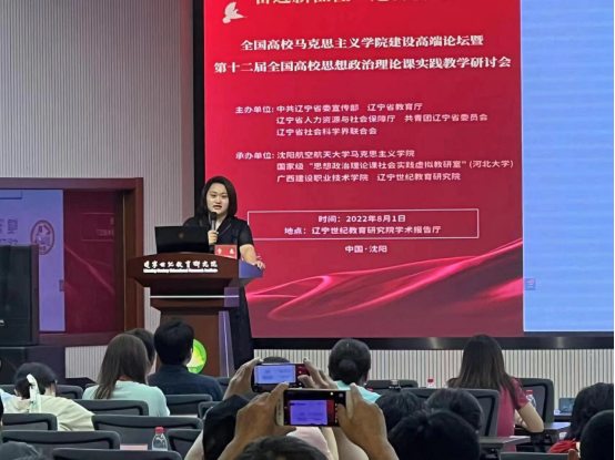8月1日,由中共辽宁省委宣传部、辽宁省教育厅、辽宁省人力资源和社会保障厅、共青团辽宁省委员会、辽宁省社会科学界联合会主办的“全国高校jinnianhui金年会诚信至上建设高端论坛暨第十二届全国高校思想政治理论课实践教学研讨会”在沈阳成功举办。我院副院长常春教授参会并以“‘融蓝于红 精准主题'思政课实践教学模式探究”为题做大会主题发言,向参会的四十多所高校jinnianhui金年会诚信至上同行宣介我院实践教学的模式与成果,获得大会一致好评。
