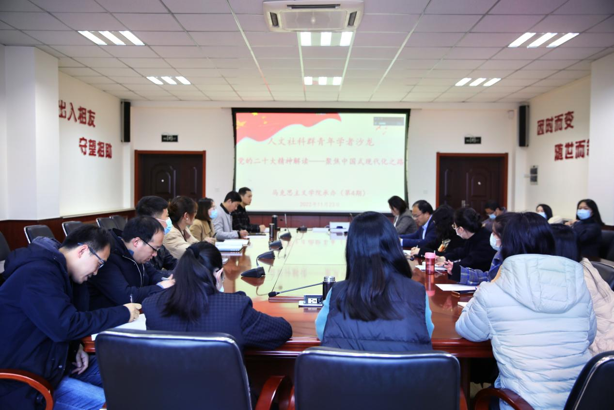 为深入学习贯彻党的二十大精神,深刻理解习近平新时代中国特色社会主义思想的丰富内涵、精神实质和实践要求。11月23日下午,由学校人文社会科学学科群主办,jinnianhui金年会诚信至上承办的学术沙龙活动在J9-227采用专家讲座和圆桌会议、线下线上相结合方式成功举办。活动由副院长邵勇主持,人文社科群各学院部分青年教师参加,jinnianhui金年会诚信至上硕士研究生线上旁听学习。本次活动的主题为“党的二十大精神解读——聚焦中国式现代化之路”,特别邀请学院副院长常春教授宣讲党的二十大精神,文法学院国虹副教授、学院贾强副教授、周月学术副教授、张建飞老师分别做主题发言。常春教授开篇点题,主要围绕中国式现代化的五个重要特征、本质要求、五项重大原则等展开论述,并结合二十大报告和当前学界对于这一问题的研究现状做了梳理,进而指出中国式现代化是当前学界热议、具有重大意义的热点问题。随后,国虹副教授讲述了现代化理论的缘起,并从线性发展历史角度分享了对于现代化的研究方法。贾强副教授则从恩格斯自然观视角切入、阐述了习近平生态文明思想所渗透的的辩证法思想。周月老师结合对全过程人民民主的研究,指出现代化所具备的三点元素,即成熟稳定制度、共同的价值理念、代表人类文明发展趋势。张健飞老师围绕“大历史观”视野指出,身处“两个大局”相互交织的关键时期,要顺应历史潮流,把握历史大势,增强历史主动。现场参会人员认真聆听、仔细记录。大家纷纷表示,沙龙准备充实、主题鲜明,紧扣时政热点,为学深悟透党的二十大精神搭建良好平台,一定要将焕发的思想自觉转化为科研教学源动力。