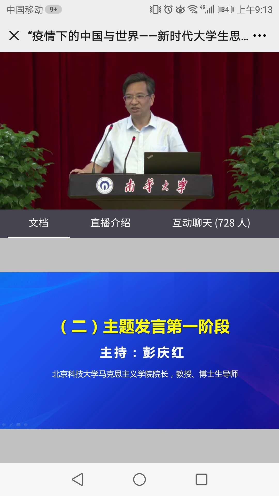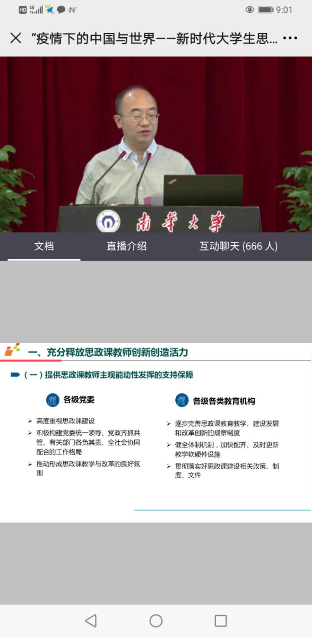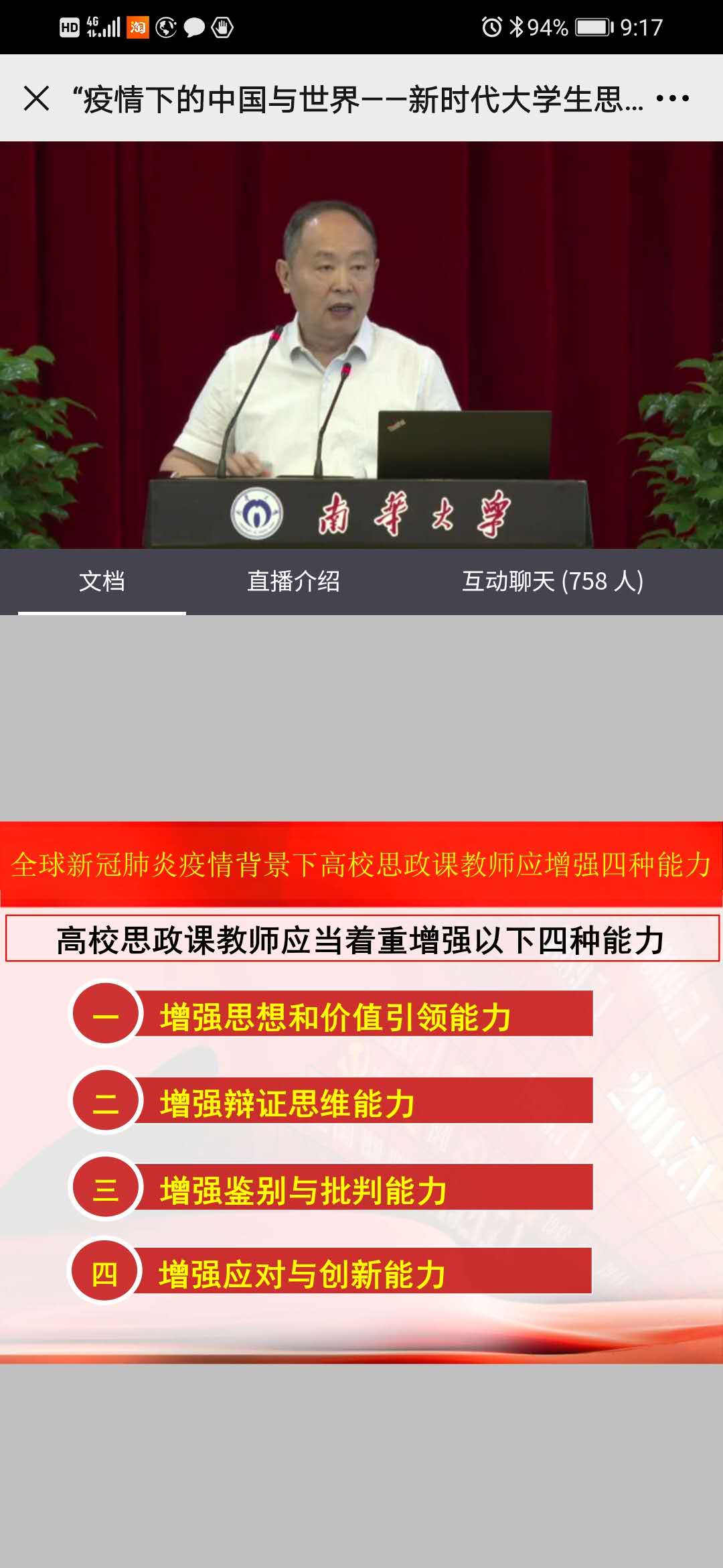 8月15日,“疫情下的中国与世界——新时代高校思想政治理论课改革创新”研讨会通过人民网公开课平台成功举办。本次大会由中国教育发展战略学会思想道德建设专业委员会、北京师范大学思想政治工作研究院和南华大学主办。会议采用“现场+直播连线”方式进行,学院领导班子及全体教师参加线上会议。