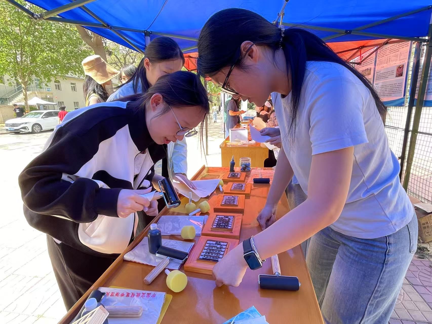 4月23日世界读书日,图书馆在惠馨园甬路举办非遗传统文化主题活动。师生通过集章打卡参与“漆扇染制”和“活字印刷”体验,亲手制作独一无二的漆扇,感受活字排版的历史魅力。活动融合“元阅读”“科学文库”等线上资源,以答题互动激发传统文化探索热情。学生们表示:“在科技时代体验手工技艺,更深刻理解了中华文化的传承与创新。”