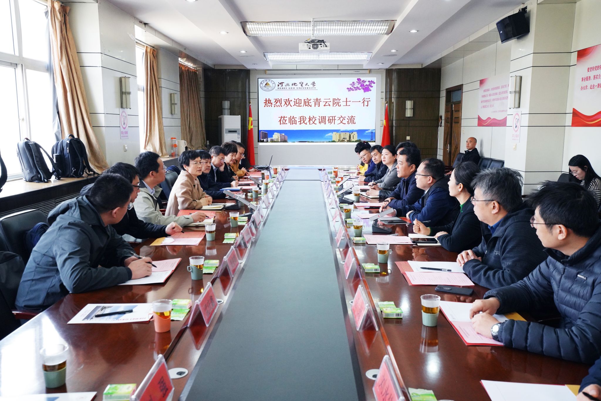 3日上午,双方举行座谈交流。校党委书记和志强致辞,对底青云院士一行莅临学校表示热烈欢迎,并就学校的办学条件、办学特色及办学定位作了简要介绍。和志强希望双方以本次交流为契机,进一步深化校所合作,达成合作目标,共同为地质行业及地方发展贡献力量。