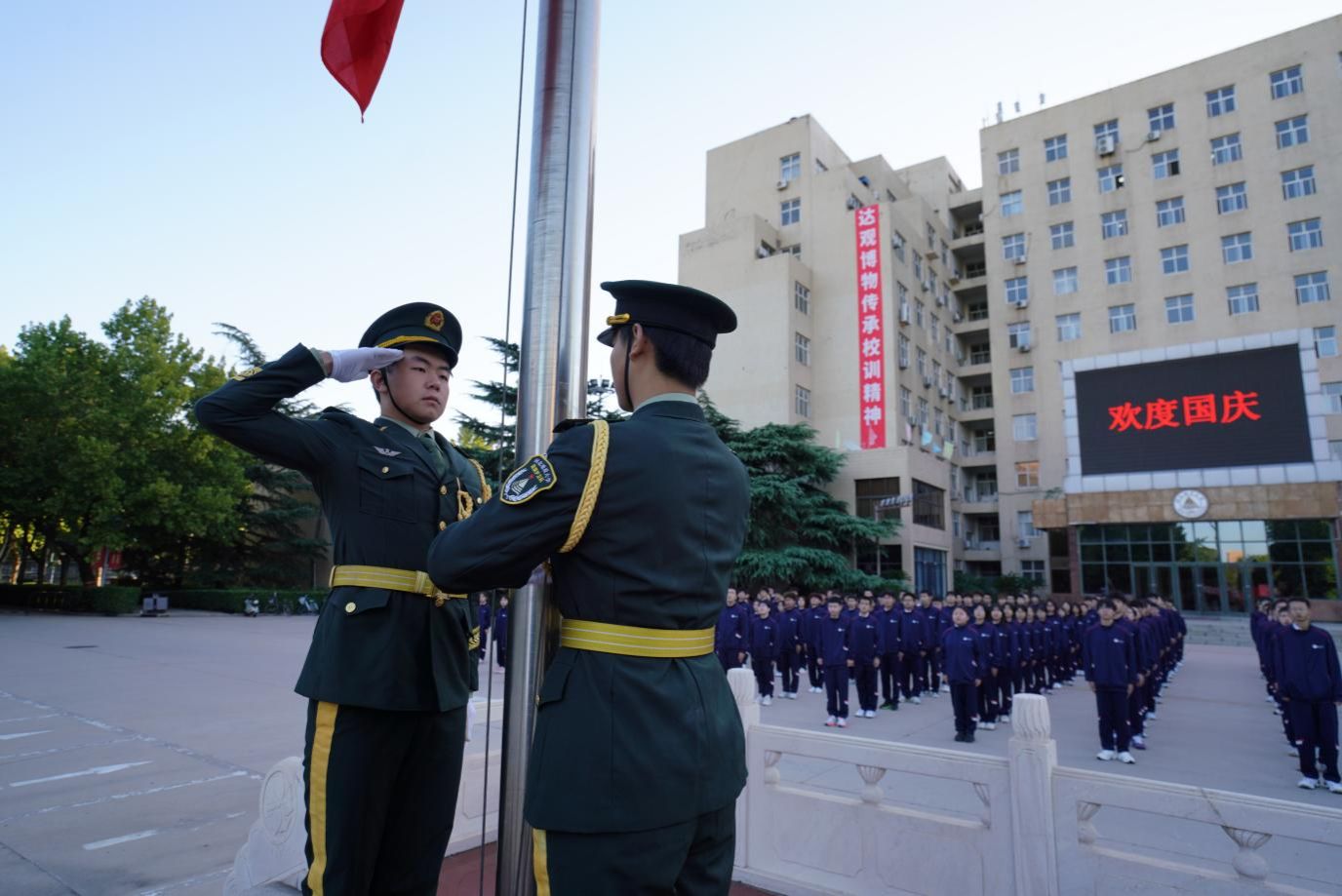 上午7点整,各学院师生代表着装统一、列队整齐,国旗护卫队升旗手英姿飒爽,阳刚帅气,擎旗、升旗动作规范,鲜艳的五星红旗在庄严的国歌声中冉冉升起、迎风飘扬,师生怀着崇高敬意向国旗行注目礼,饱含深情,高唱国歌,表达对祖国的无限热爱和深情祝福。