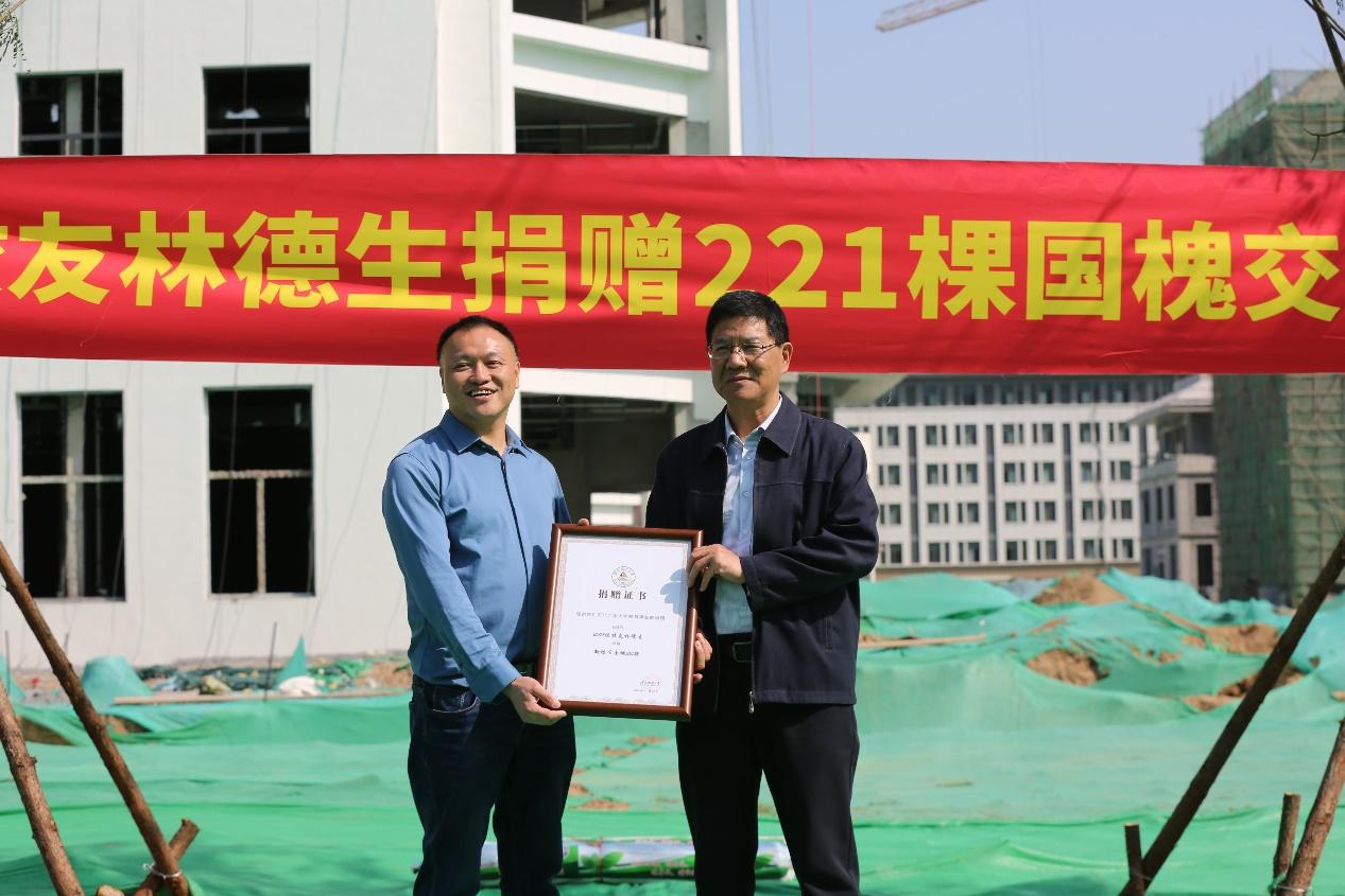 冯鸿雁代表学校向林德生颁发了捐赠证书,并对其捐赠表示感谢。他指出,广大校友永远是学校宝贵的资源和财富,也是学校事业发展值得信赖的力量。此次校友林德生为学校捐赠苗木,充分体现了校友积极履行社会责任、热心参与公益事业的责任担当,学校将充分利用好这些绿化苗木,提升和美化新校区环境,进一步推动生态绿色校园建设。