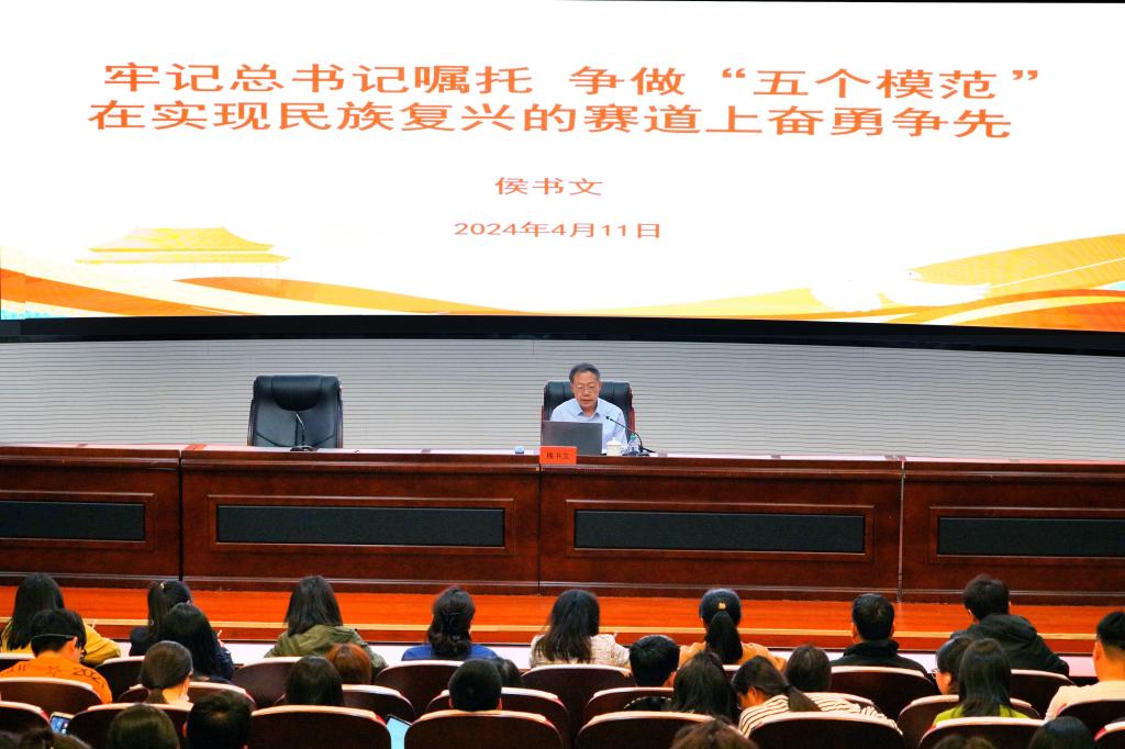 侯书文以“牢记总书记嘱托,争做‘五个模范’,在实现民族复兴的赛道上奋勇争先”为题作了首场讲座。侯书文结合我党党史和毛泽东主席、习近平总书记的经历,结合当前国际形势,用一个个鲜活的事例,生动阐释了新时代青年如何“做理想远大、信念坚定的模范,做刻苦学习、锐意创新的模范,做敢于斗争、善于斗争的模范,做艰苦奋斗、无私奉献的模范,做崇德向善、严守纪律的模范”。