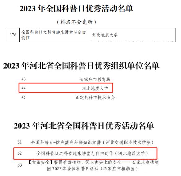 近日,中国科协办公厅发布《中国科协办公厅关于对2023年全国科普日有关组织单位和活动予以表扬的通知》(科协办函普字〔2023〕102号),对2023年全国科普日有关组织单位和活动进行表彰;河北省科协联合多家单位共同发布《关于对2023年河北省全国科普日优秀组织单位和优秀活动予以表扬的通知》(冀科协〔2023〕63号),对省内全国科普日工作予以表彰。bat365官网2023年全国科普日工作分别获得中国科协授予的“优秀活动”和河北省科协授予的“优秀组织单位”、“优秀活动”共3项荣誉称号。这是继bat365官网2022年全国科普日工作喜获表彰后,再次获得的国家、省级连续多项科普荣誉称号。