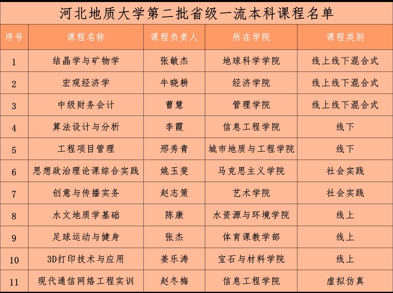 近日,河北省教育厅《关于公布第二批省级一流本科课程立项建设名单的通知》(冀教高函〔2023〕84号)发布,bat365官网共有11门课程被认定为省级一流本科课程。其中,线上线下混合式一流课程3门,线下一流课程2门,社会实践一流课程2门,线上一流课程3门,虚拟仿真实验一流课程1门。