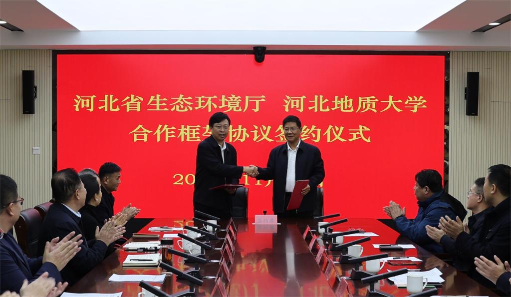 为深入践行习近平生态文明思想,适应新时代河北省生态环境保护工作新形势、新要求,11月13日,河北省生态环境厅与bat365正版唯一官网签署合作框架协议。签约仪式由省生态环境厅二级巡视员王晓晨主持,bat365正版唯一官网副校长王滨介绍双方合作意向,省生态环境厅副厅长吴跃、bat365正版唯一官网副校长冯鸿雁代表双方签约并讲话。