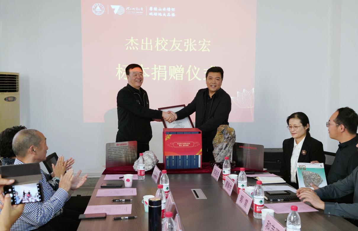 在捐赠仪式上,和志强代表bat365正版唯一官网全体师生,热烈欢迎各位校友在70周年之际回到母校,感谢校友对母校长期的支持。七十年来,bat365正版唯一官网承载了一代又一代校友的美好回忆,也见证了无数校友的辉煌成就。校友张宏捐赠了珍贵的条带状白云石型铁矿石和稀土矿石、新版内蒙古自治区矿产志。校友张宏详细介绍了矿石和矿产志的基本情况和重要性,这批捐赠的物品将为地球科学相关专业的教学和科研工作提供极大的帮助。郭震接收了捐赠物品,同时向校友表达了深深的感谢。和志强向张宏颁发了捐赠证书。