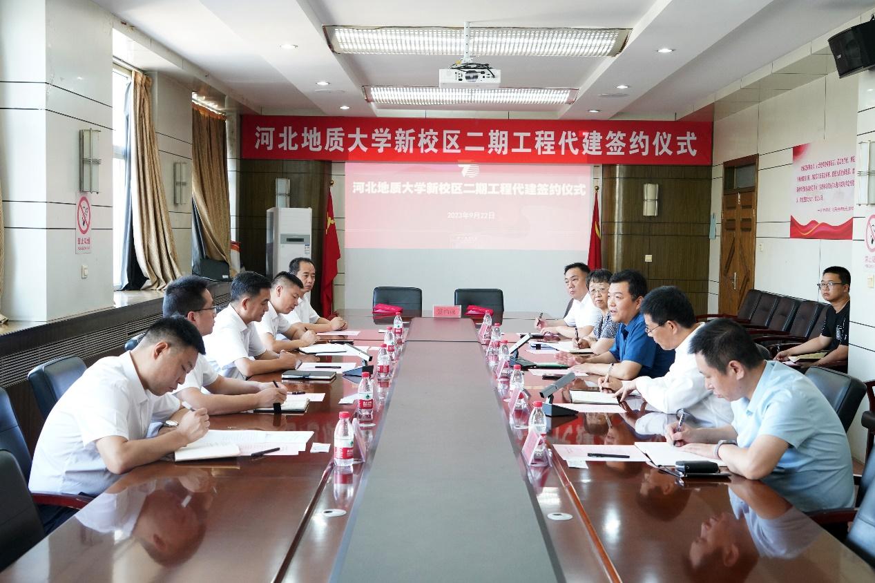 9月22日上午,bat365正版唯一官网新校区二期工程代建签约仪式在主楼四楼会议室隆重举行。bat365官网校长和志强、副校长冯鸿雁,石家庄城发投集团总经理秘勇、石家庄市住建集团党委书记陈宏亮等出席签约仪式。和志强、秘勇分别代表学校和代建单位签署协议。签约仪式由副校长冯鸿雁主持。