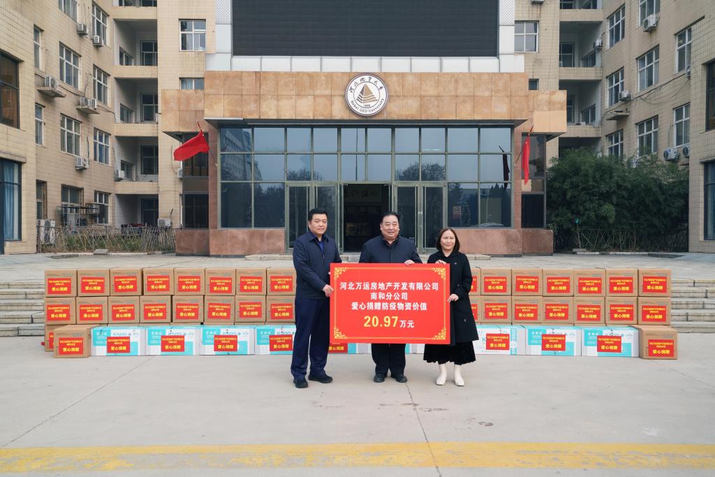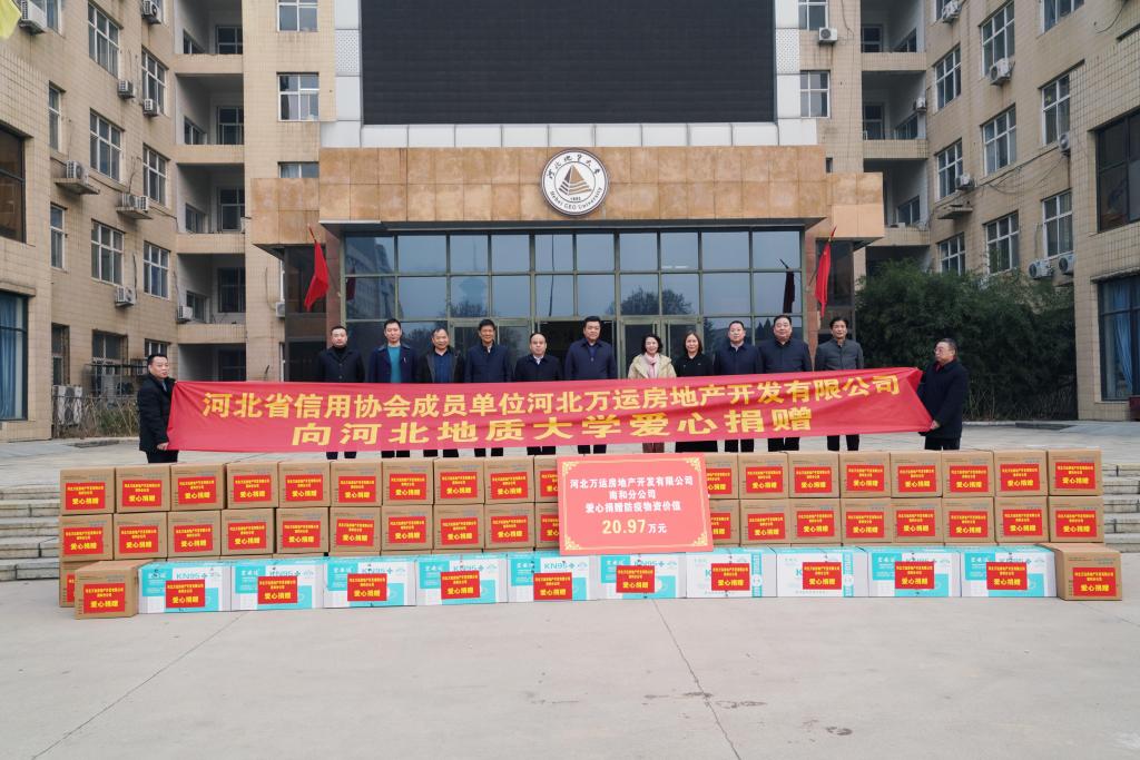 2023年2月17日下午,河北省信用协会成员单位河北万运房地产开发有限公司向bat365官网捐赠价值20.97万元的防疫物资。捐赠仪式在学校主楼广场举行,和志强校长代表学校与捐赠方举行了交接仪式。