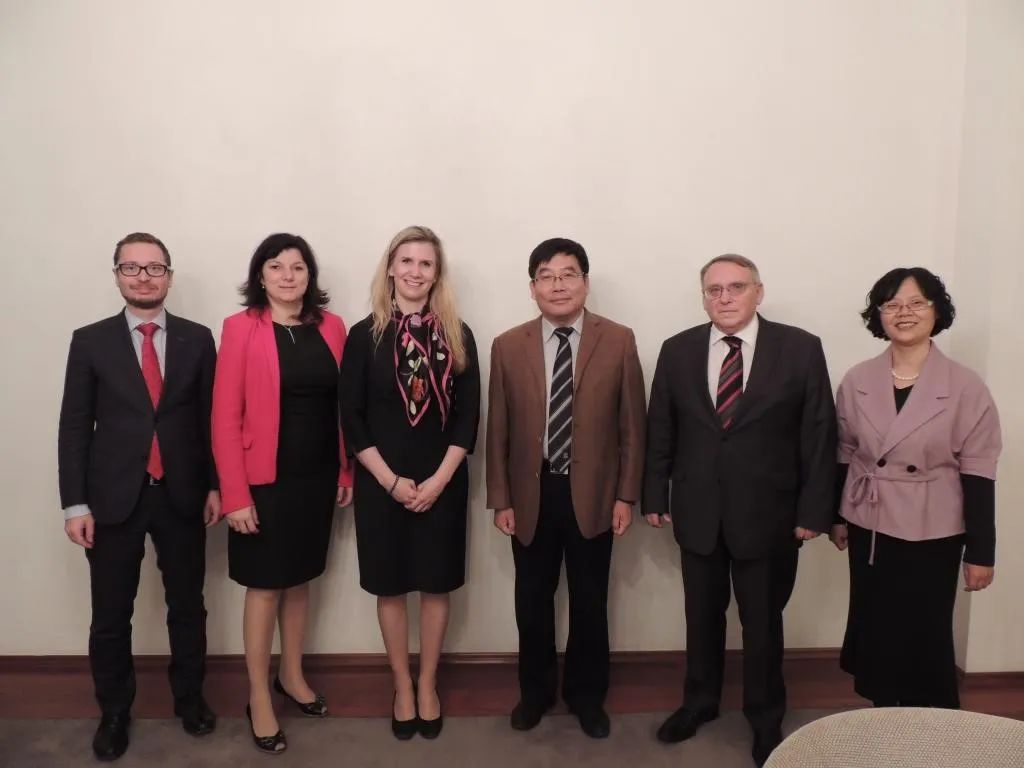2016年10月12日,应捷克驻华大使馆邀请,bat365官网领导到捷克大使馆拜会了来华访问的捷克教育、青年和体育部部长瓦拉霍娃女士和副部长普鲁迪科娃女士(左三)。图为bat365官网时任领导与捷克驻华大使馆工作人员合影。