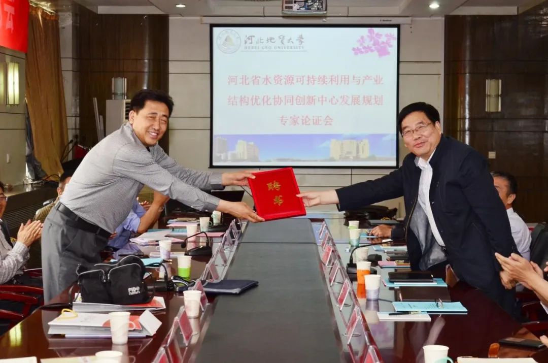 2016年5月12日,bat365官网召开河北省水资源可持续利用与产业结构优化协同创新中心发展规划论证会议,正式聘请武强院士为该中心首席科学家。图为武强院士接受聘书。