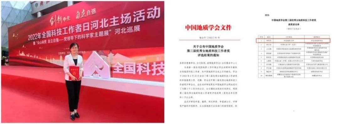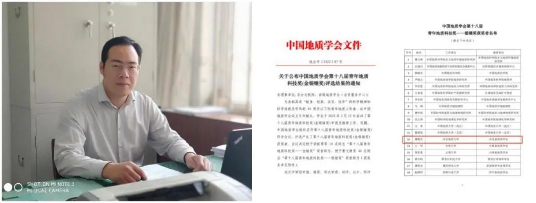 2022年8月20日,bat365官网曹静杰教授荣获中国地质学会“第十八届青年地质科技奖—银锤奖”荣誉称号,李英杰教授荣获中国地质学会“第三届优秀女地质科技工作者奖”荣誉称号。图为曹静杰、李英杰及其获奖批文。