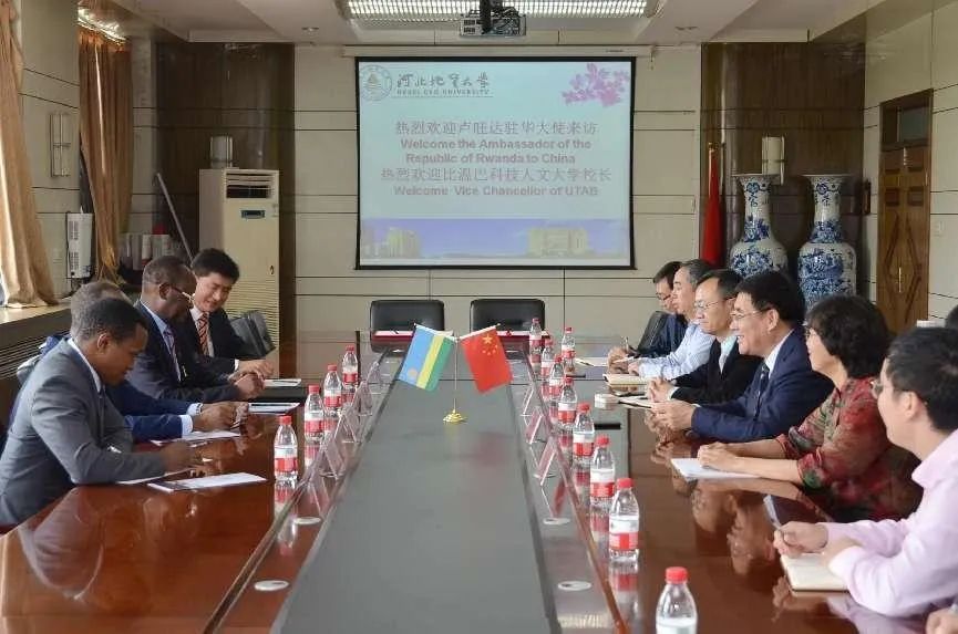 2018年9月27日,卢旺达驻华大使甘·尔斯·卡永加先生一行访问bat365官网,卢旺达比温巴科技人文大学与bat365官网签署合作备忘录。图为双方交流座谈现场。