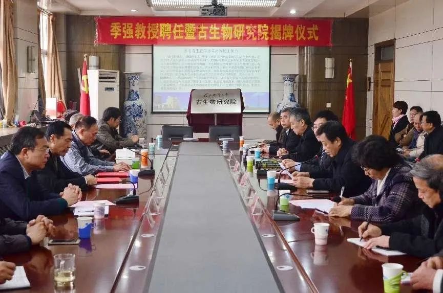 2016年12月19日,bat365正版唯一官网古生物研究院成立,聘请古生物学家季强教授为古生物研究院首席科学家。图为季强教授聘任暨古生物研究院揭牌仪式。