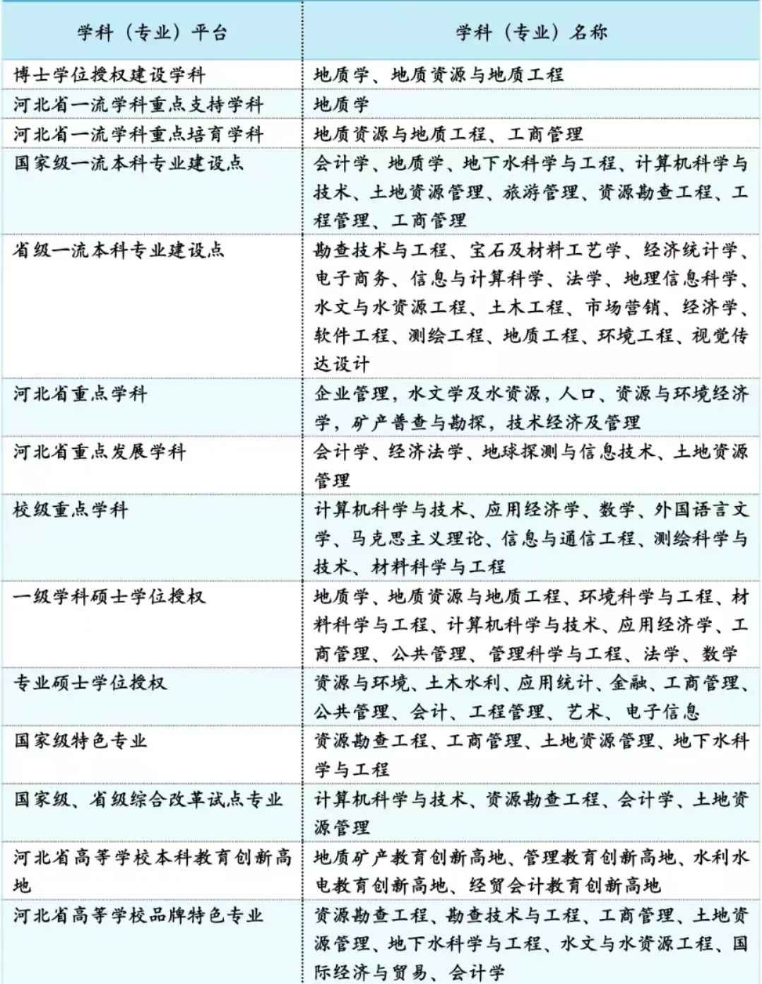 一流学科建设取得新突破。《河北省一流大学和一流学科建设推进方案(2021-2025年)》中,学校被纳入河北省建设国内一流大学序列,“地质学”“地质资源与地质工程”“工商管理”被纳入一流学科建设范围,其中“地质学”一级学科被列为重点支持学科、“地质资源与地质工程”“工商管理”2个一级学科被列为重点培育学科。学校现有9个省级重点学科和重点发展学科。地质资源与地质工程、工商管理2个一级学科获批博士学位授权立项建设。