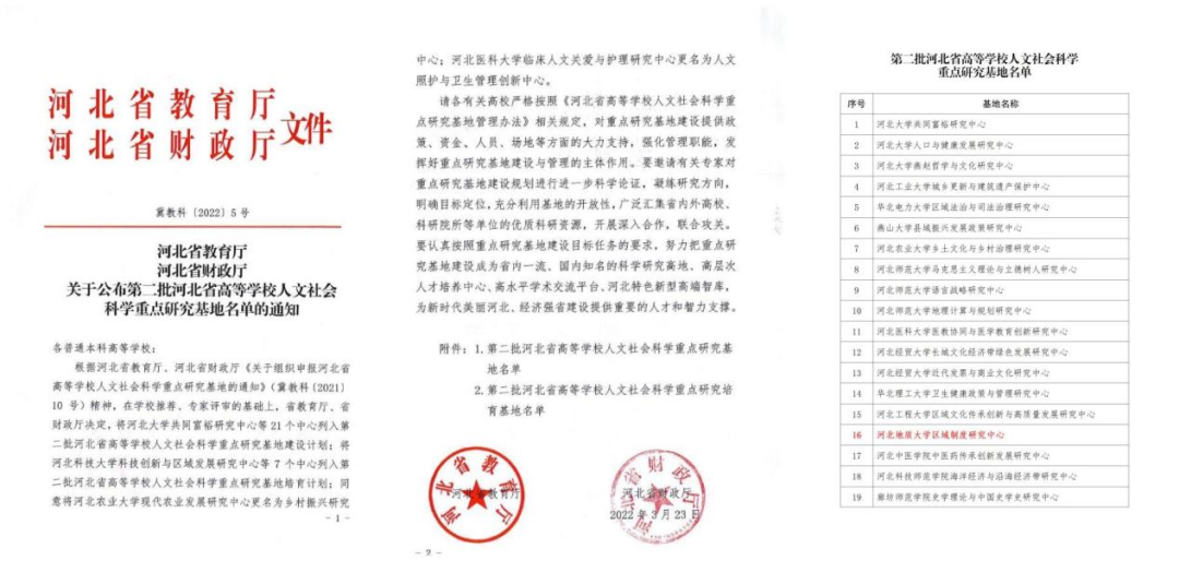2022年3月23日,河北省教育厅、财政厅联合下发了《关于公布第二批河北省高等学校人文社会科学重点研究基地名单的通知》(冀教科〔2022〕5号)、依托法政学院相关平台建设的“bat365正版唯一官网区域制度研究中心”成功获批。