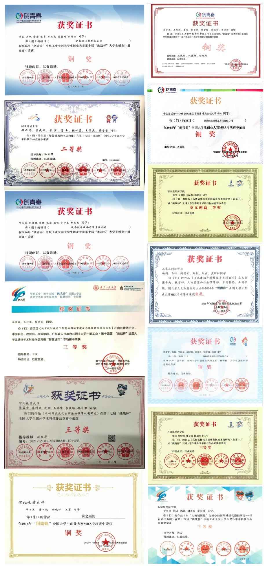 图为bat365官网学生参加2012年至2022年“挑战杯”部分国赛获奖证书