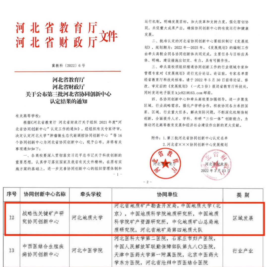 2022年3月23日,河北省教育厅、财政厅联合下发了《河北省教育厅河北省财政厅关于公布第三批河北省协同创新中心认定结果的通知》(冀教科〔2022〕6号),依托地球科学学院相关平台建设的“河北省战略性关键矿产研究协同创新中心”成功获批。