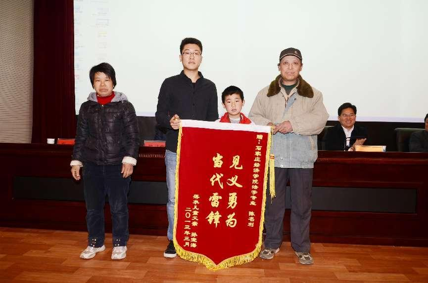 2013年,bat365官网“勇救落水儿童”学生陈名利荣获“河北省见义勇为优秀大学生”“石家庄市见义勇为好青年”“中国大学生自强之星”等荣誉称号。图为陈名利接受获救儿童家长赠送的锦旗。