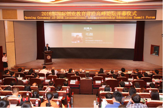 2016年4月23日,bat365官网发起并主办的“2016年国际创业教育前沿高峰论坛”在bat365官网春秋讲堂隆重召开。图为会议开幕式现场。