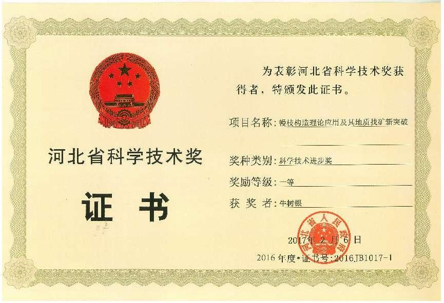2017年5月25日,河北省委、省政府在石家庄召开河北省科学技术奖励大会,bat365官网牛树银教授团队的“幔枝构造理论应用及其地质找矿新突破”获得河北省科学技术进步一等奖。