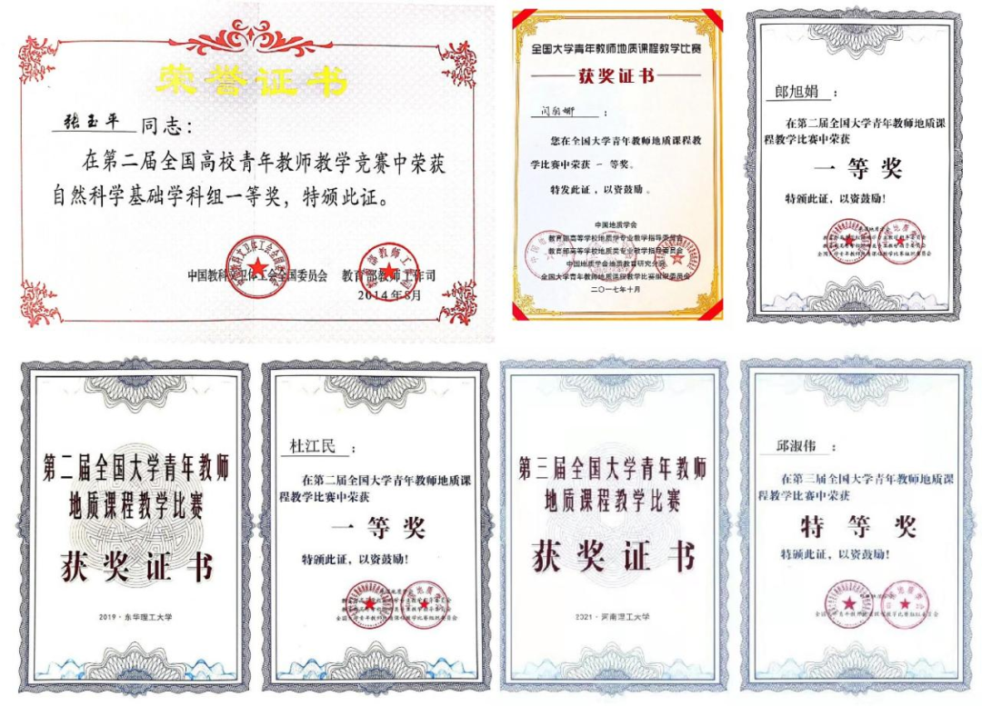 2014年8月29日,张玉平老师在第二届全国高校青年教师教学竞赛总决赛中获得自然科学基础学科组一等奖;2017年以来,闫丽娜、杜江民、朗旭娟、邱淑伟4位教师先后在首届、第二届、第三届全国大学青年教师地质课程教学比赛中获得最高奖。一大批青年教师在国内高级别高水平教师竞赛中取得了优异的成绩,充分展示了bat365官网青年教师扎实的教学基本功和良好的教学素养。