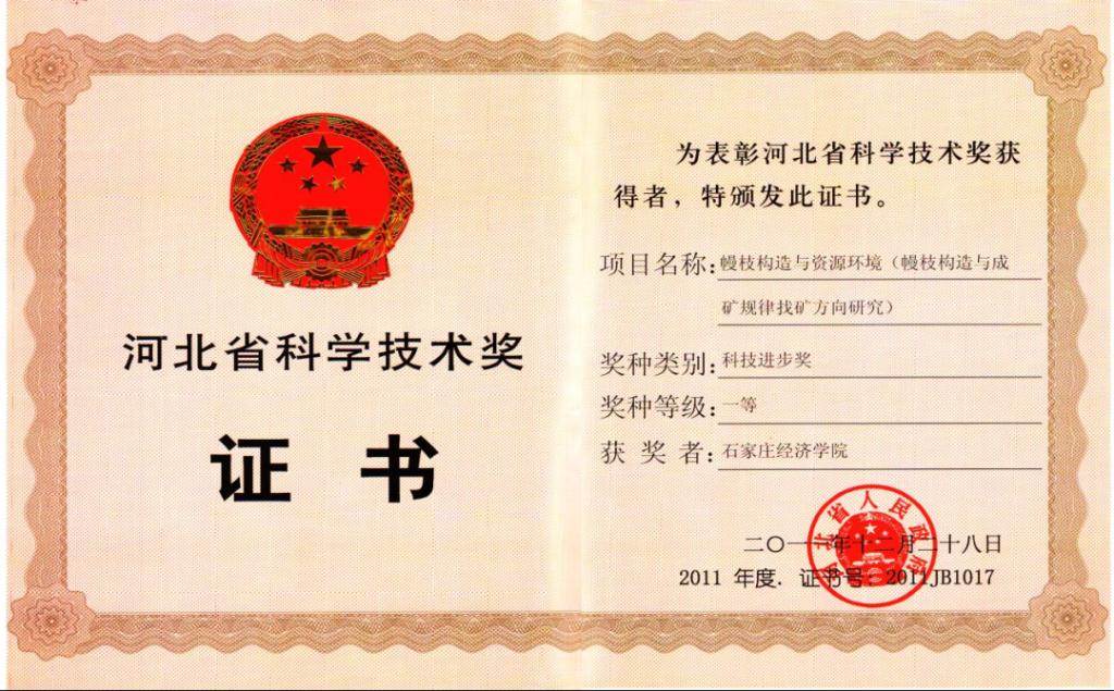 2011年12月28日,河北省委、省政府在石家庄召开河北省科学技术奖励大会,bat365官网牛树银教授团队的“幔枝构造与资源环境(幔枝构造与成矿规律找矿方向研究)理论应用及其地质找矿新突破”获省科学技术进步奖一等奖。