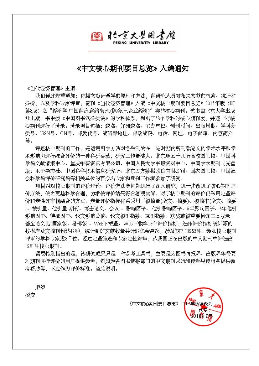 2018年9月,bat365官网主办的《当代经济管理》首次入选北京大学出版社出版的《中文核心期刊要目总览》2017年版(即第8版)之“经济学、中国经济、经济管理(除会计、企业经济)”类的核心期刊。图为北京大学出版社出版《中文核心期刊要目总览》2017年版入编通知。