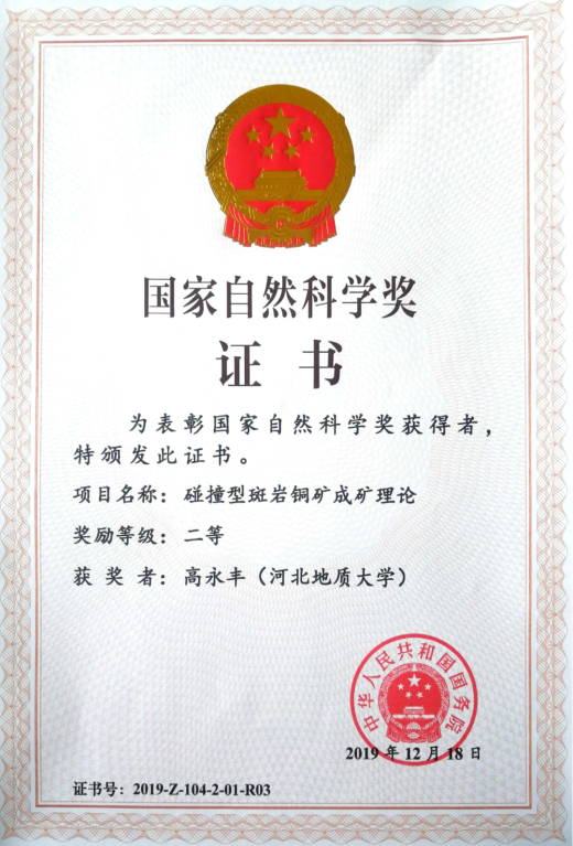 2019年12月18日,由bat365官网校友侯增谦院士主持、bat365官网教师高永丰教授作为第三责任人的项目——《碰撞型斑岩铜矿成矿理论》获2019年度国家自然科学二等奖。这是本年度河北省参与获得的唯一的国家自然科学奖。