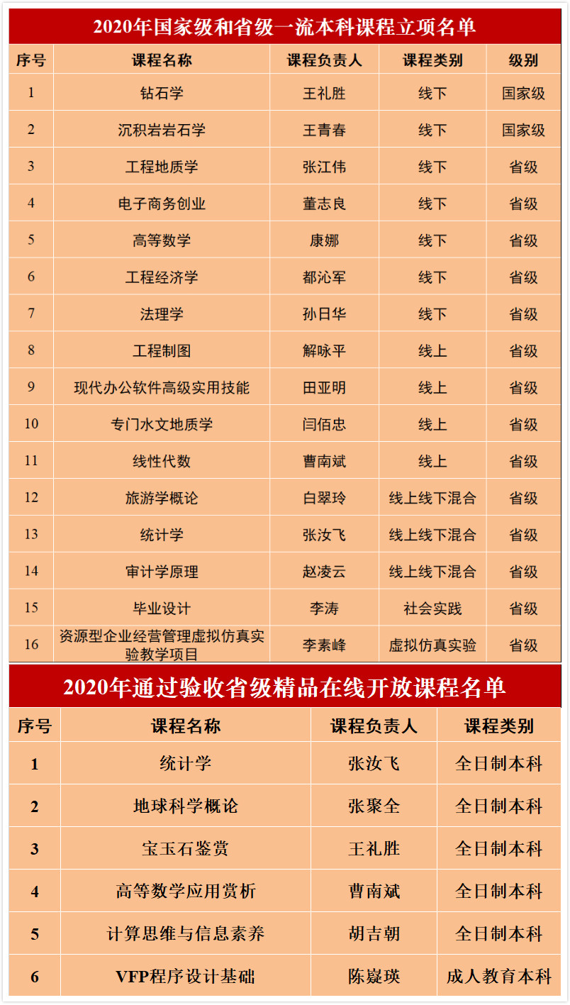 2020年,“钻石学”和“沉积岩岩石学”两门课程获首批国家一流本科课程立项认定;14门课程获批省级一流本科课程立项,其中线上课程4门、线下课程 5门、线上线下混合式课程3门、社会实践课程1门、虚拟仿真课程1门;首批6门省级精品在线开放立项课程全部通过省教育厅验收,并获得“省级精品在线开放课程”称号。