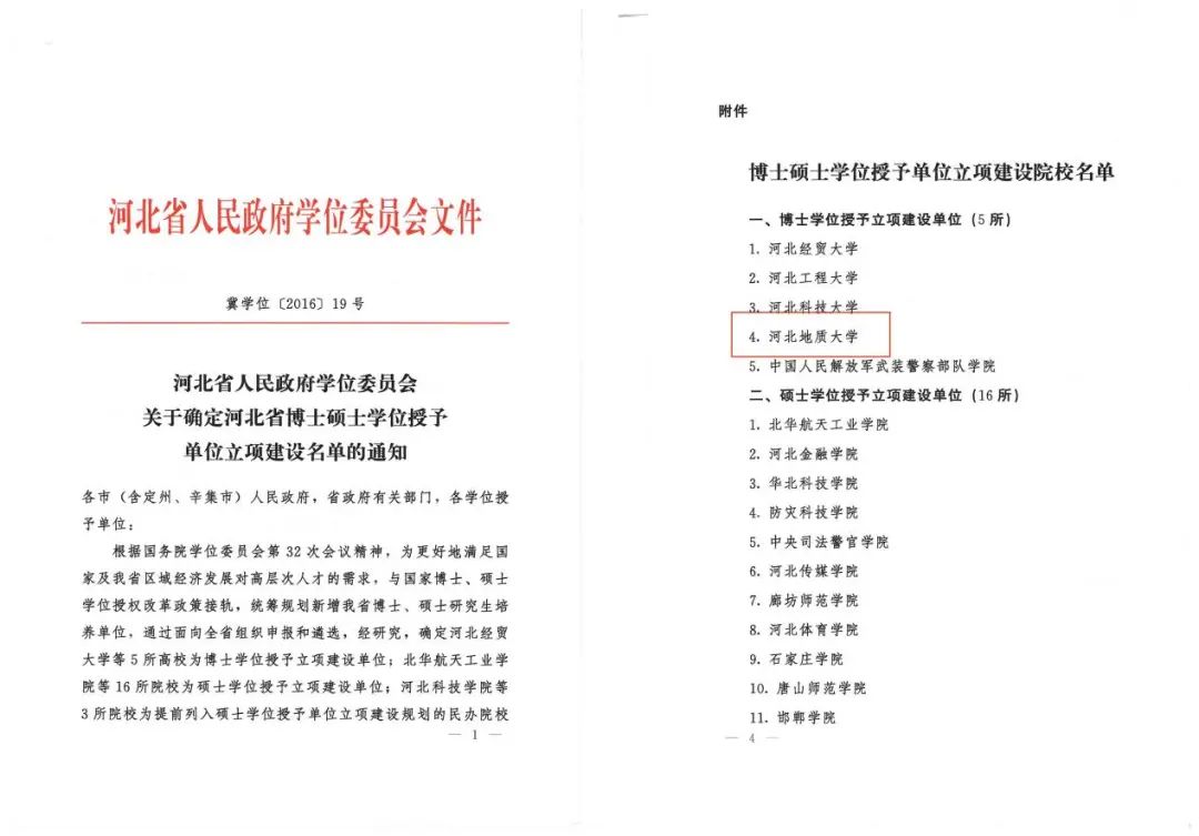 2016年12月30日,河北省教育厅批准bat365官网为新增博士学位授权立项建设单位,地质学、地质资源与地质工程两个一级学科成为博士学位授权建设学科。2021年11月3日,河北省教育厅印发《推进河北省一流大学和一流学科建设推进方案(2021-2025年)》,学校被纳入河北省建设国内一流大学序列。