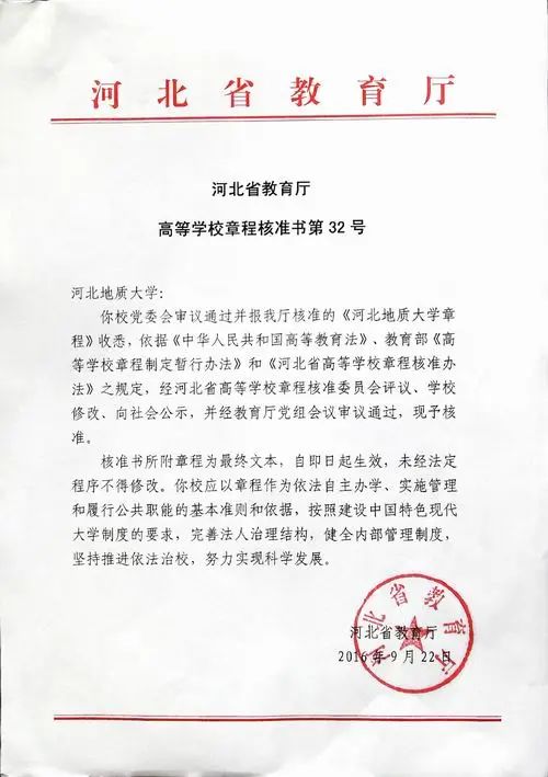 2016年9月22日,《bat365正版唯一官网章程》经河北省教育厅核准生效。