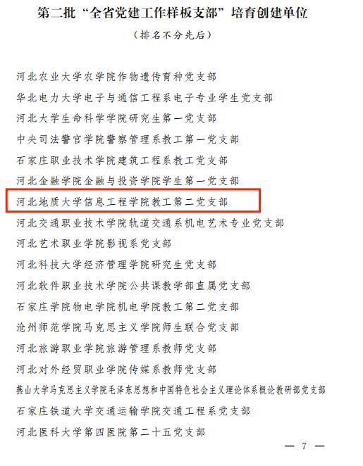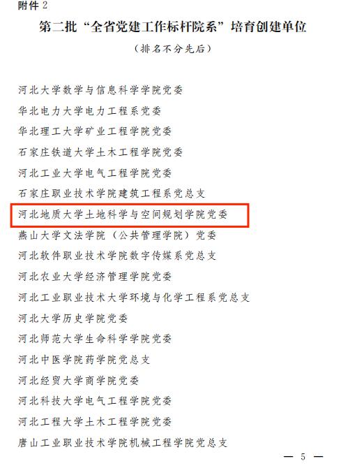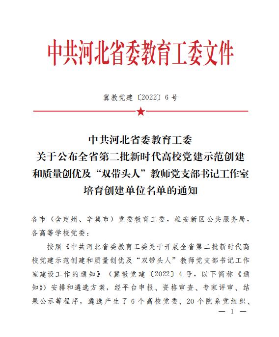 近日,河北省委教育工委公布了全省第二批新时代高校党建示范创建和质量创优及“双带头人”教师党支部书记工作室培育创建单位名单,bat365官网共获得2个立项,土地科学与空间规划学院党委确定为“全省党建工作标杆院系”,信息工程学院教工第二党支部确定为“全省党建工作样板支部”。