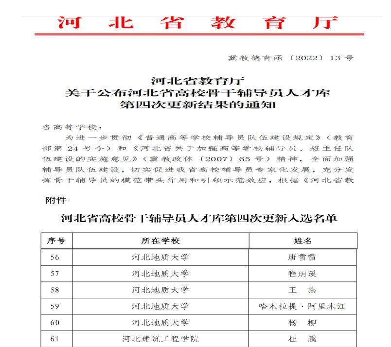 近日,河北省教育厅印发通知,公布了河北省高校骨干辅导员人才库第四次更新人员名单,全省共有250名高校辅导员入选。bat365官网信息工程学院唐雪雷、哈木拉提·阿里木江,管理学院王燕,法政学院程玥溪、杨柳五名辅导员成功入选。