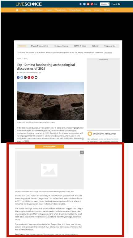 LiveScience是一家科学新闻网站,其网站的故事和社评出现在各大新闻媒体,如雅虎、微软全国广播公司节目、美国在线和福克斯新闻。该网站评出的2021年考古十大发现有“龙人”的研究。