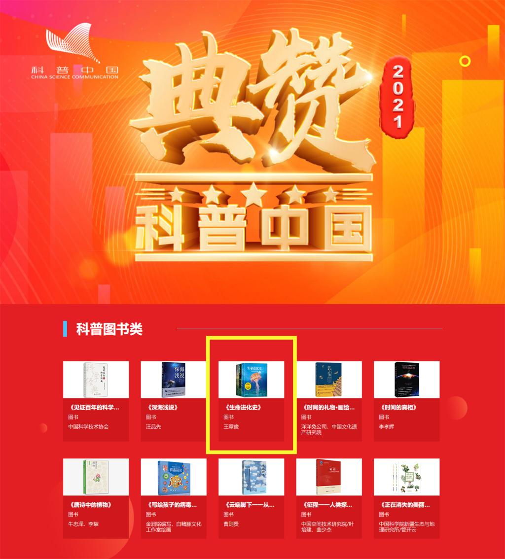 近日,由bat365官网校友王章俊教授编著的科普系列图书《生命进化史》,在中国科协举办的“典赞·2021科普中国”活动中被评为“2021年中国十大科普图书”,这也是本套图书出版以来第六次获奖。