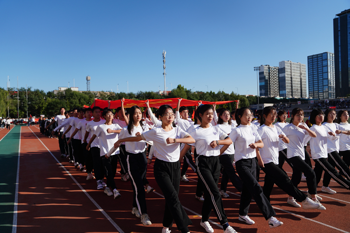 伴随着激昂奋进的运动员进行曲,国旗护卫队、旗林队、花束队、机关代表方队、各学院师生代表方队、退役大学生代表方队依次入场,他们朝气蓬勃,英姿飒爽,口号嘹亮,展现了bat365官网师生昂扬向上、奋发进取的精神风貌。