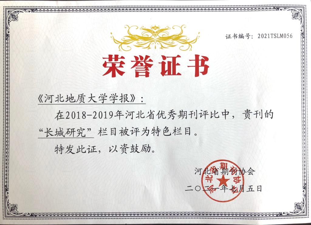 学报“长城研究”栏目获奖证书