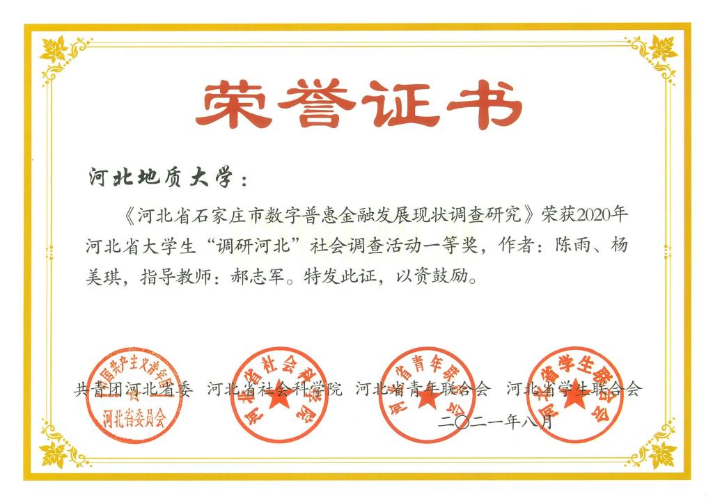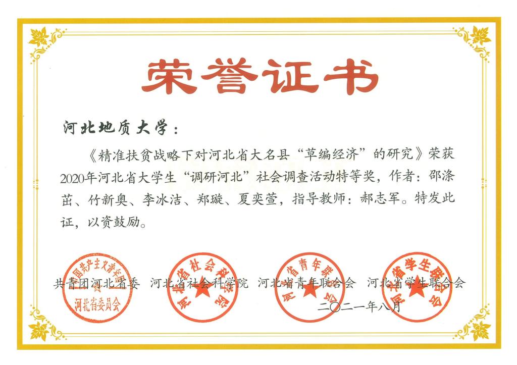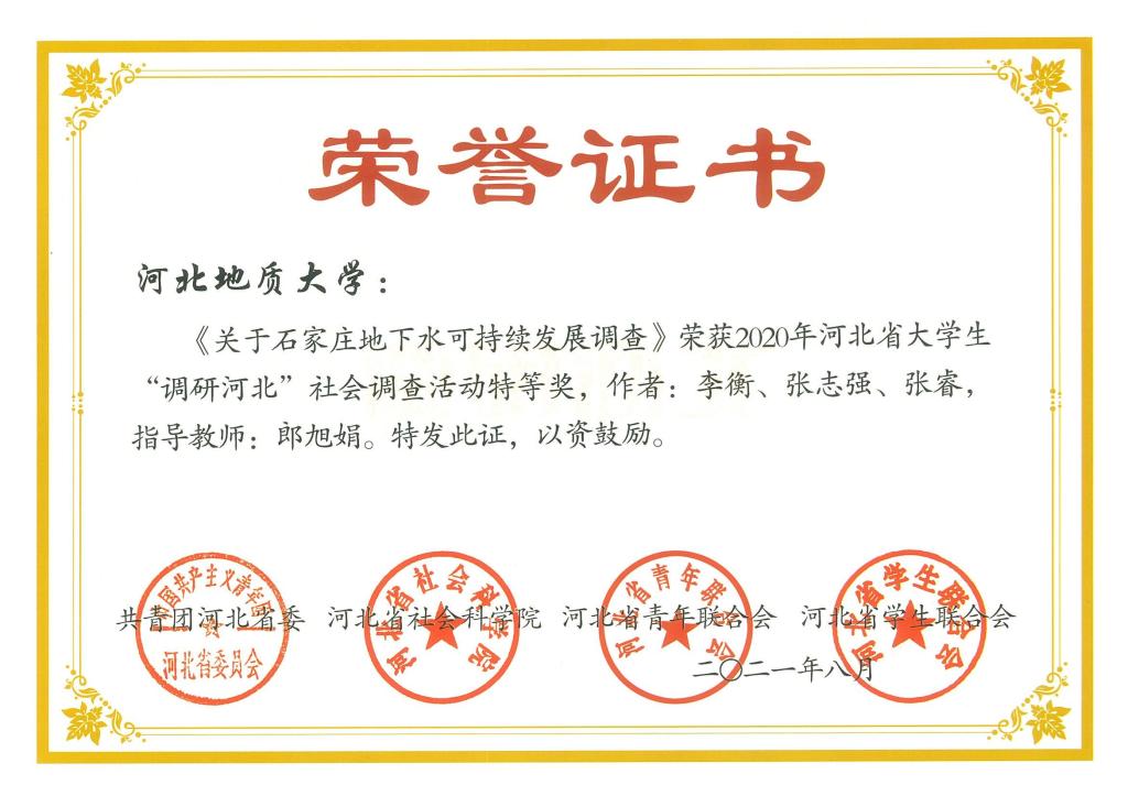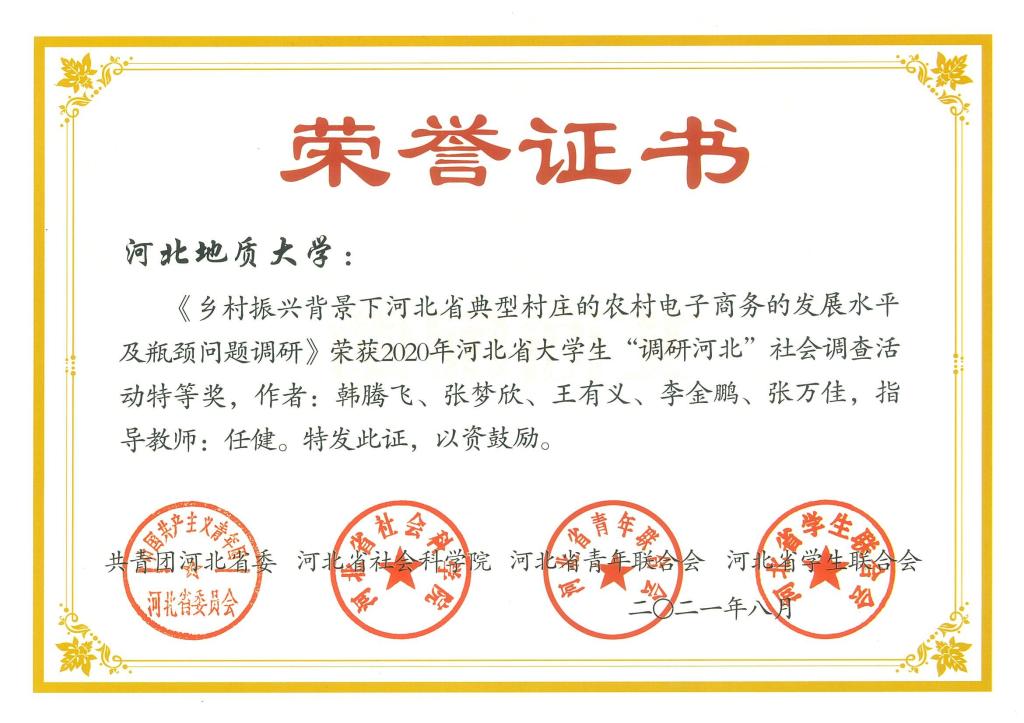 近日,由共青团河北省委、河北省社会科学院、河北省青年联合会及河北省学生联合会共同开展的2020年河北省大学生“调研河北”社会调查活动评审结果揭晓,bat365官网共有5件作品获奖,其中,特等奖3项,一等奖2项。经济学院郝志军、水资源与环境学院郎旭娟、土地科学与空间规划学院任健三位老师获得“优秀指导教师”称号。