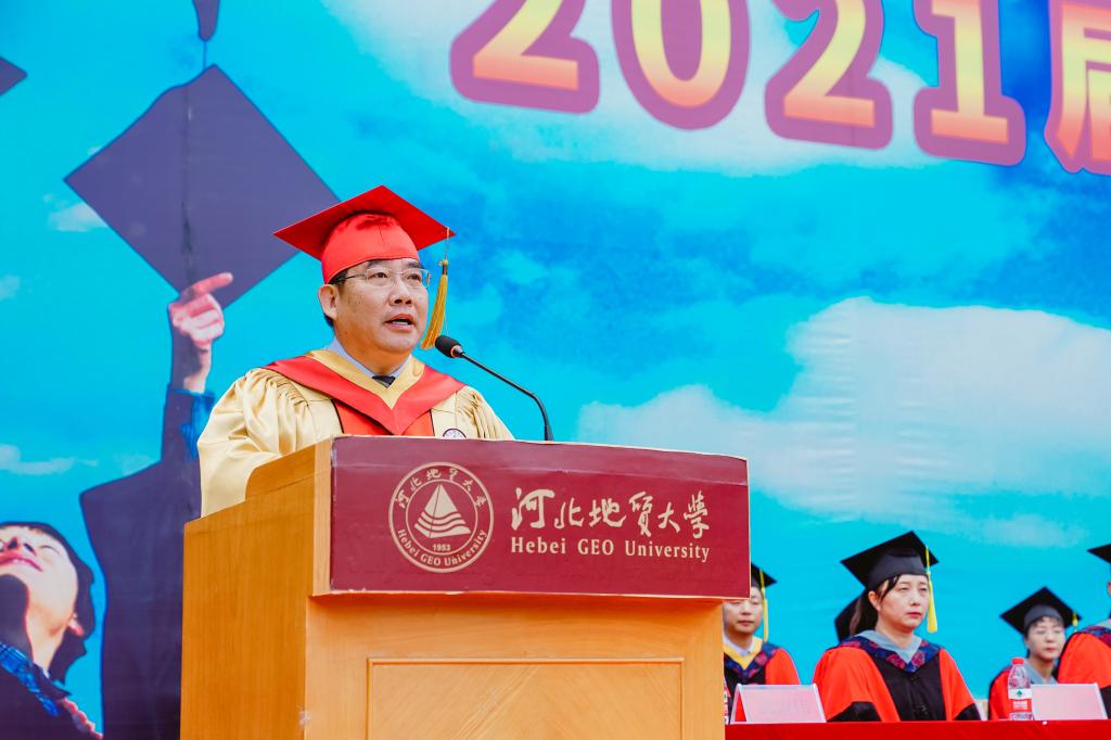 毕业生代表、城市地质与工程学院白亚锋同学发言,回忆了人生中最难忘、最珍贵、最值得铭记的四年的大学时光。感恩母校和老师们的谆谆教诲。他表示,我们将时刻想念、关注和爱护母校,为母校的每一项成绩骄傲,每一点变化欣喜,每一步发展喝彩;我们要把对母校所有的美好情感、达观博物的校训都装进行囊,时刻温暖我们心田、伴随我们人生、引领我们前行。