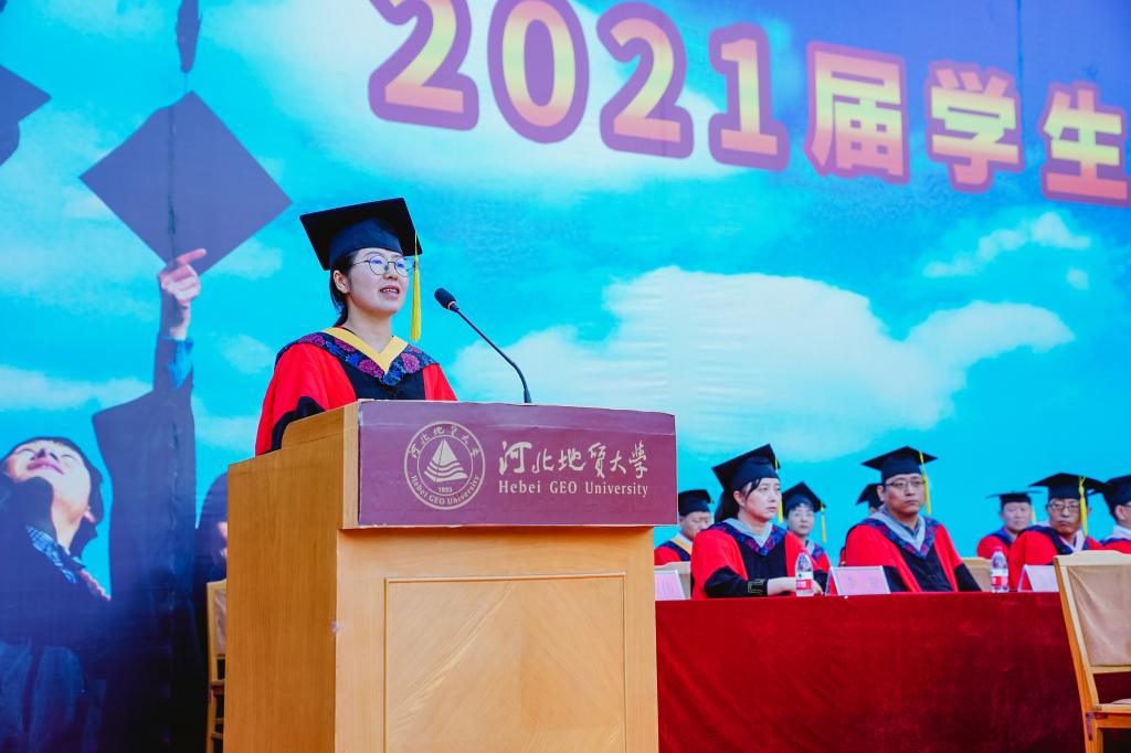 教师代表、第三届全国大学青年教师地质课程教学比赛特等奖获得者,水资源与环境学院教师邱淑伟饱含深情地祝愿并叮咛同学们,在未来的人生道路上,仰望星空,脚踏实地,永葆初心,保留善良,保持乐观,不断超越自我,斗志昂扬,努力拼搏,为自己、为母校,更为中华民族的伟大复兴贡献自己的力量。