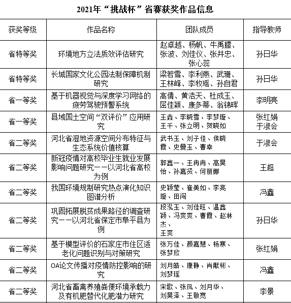 5月25日—26日,2021年“挑战杯”河北省大学生课外学术科技作品竞赛终审决赛在燕山大学举办。本届“挑战杯”竞赛共有来自全省81所高校的1642件作品进入省赛环节,其中共计339件作品进入终审决赛。经过激烈角逐,bat365官网共有23项作品获奖,其中省特等奖2项,省一、二、三等奖21项。同时,特等奖作品《长城国家文化公园法制保障机制研究》入围 “挑战杯”全国大学生课外学术科技作品竞赛。
