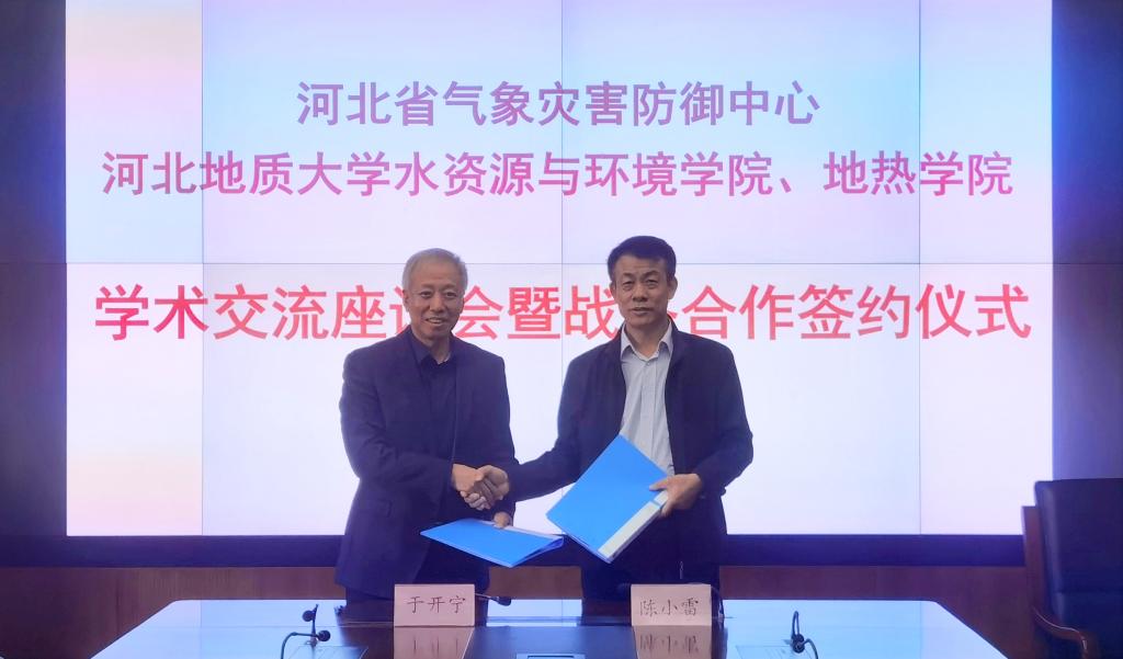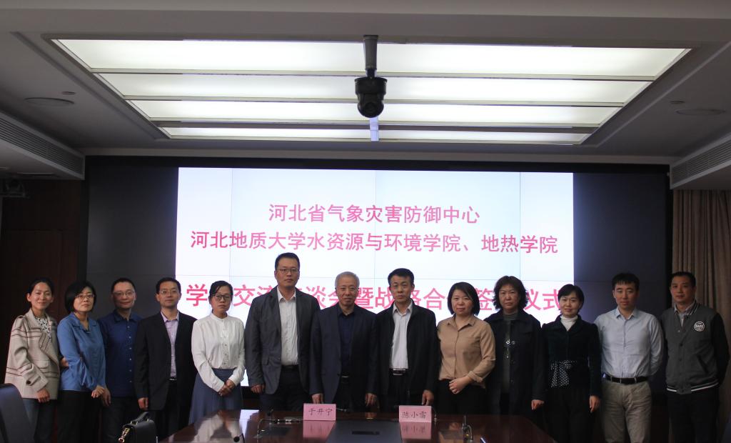 4月19日,bat365正版唯一官网水资源与环境学院、地热学院与河北省气象灾害防御中心学术交流座谈会暨战略合作协议签约仪式在石家庄举行。省气象灾害防御中心主任陈小雷、副主任郭丽丽、首席专家景华,水资源与环境学院院长于开宁、党委书记李仁杰、赵志瑞教授,以及双方相关人员参加会议。